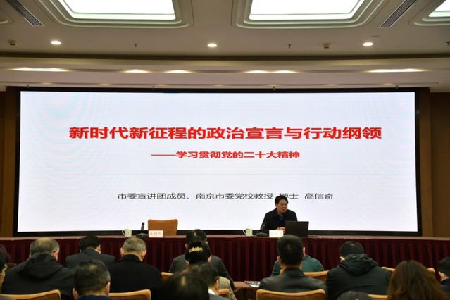 根據(jù)中央和省市委、市國資委黨委部署要求,12月2日下午,河西集團召開學習宣傳貫徹黨的二十大精神宣講會,邀請市委宣講團成員、市委黨??蒲刑幪庨L高信奇教授做專題宣講,進一步引導集團廣大黨員干部職工全面深入學習宣傳貫徹黨的二十大精神,切實把思想和行動統(tǒng)一到黨的二十大精神上來,更加深刻領悟“兩個確立”的決定性意義,不斷增強“四個意識”、堅定“四個自信”、做到“兩個維護”。會議由集團黨委副書記、董事繆昌根主持。集團領導、全體中層干部及集團下屬各公司黨務工作者參加會議。