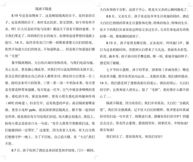 集中醫(yī)學(xué)觀察即將結(jié)束前,酒店工作人員收到了一份飽含深情的離別“禮物”。這是一封來自剛剛結(jié)束觀察生活、離開酒店順利歸家的市民朋友的感謝信,他用樸實(shí)真摯的語言回顧了與家人在酒店里生活的點(diǎn)點(diǎn)滴滴,表達(dá)了對集中觀察點(diǎn)指揮部、各工作組及國青酒店的感謝與祝福。