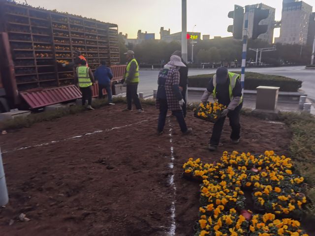 冬季的清晨,寒意逼人,園林工匠們卻干的熱火朝天。清理秋季草花、施肥整地,根據(jù)更換方案,對草花花色進(jìn)行合理搭配,以求達(dá)到花色鮮艷、品種豐富的景觀效果。在植物配置時,進(jìn)行了圖案設(shè)計,如河西大街長方形套圖、樂山路、奧體大街花境設(shè)計布置等,構(gòu)成了一幅幅靈動活潑的圖畫,不僅美化了城市景觀效果,也為冬季出行的市民呈現(xiàn)了一道靚麗的風(fēng)景線。
