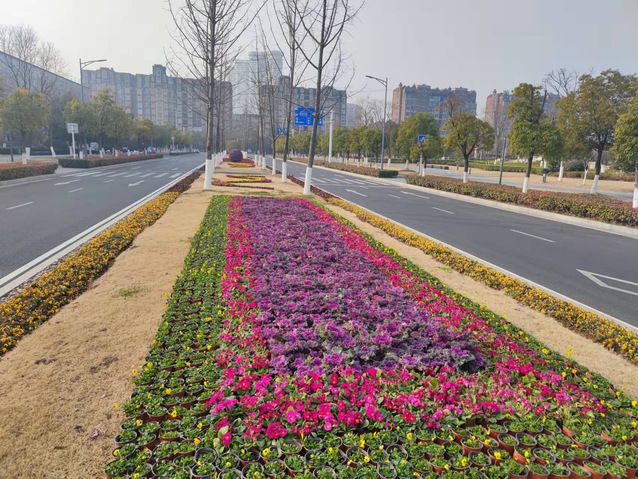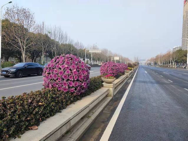 江蘇大劇院水韻路中分帶的花球也換上了“新裝”。10個巨大的羽衣甘藍(lán)花球被粉色的報春花和紅黃顏色角堇組成的花帶簇?fù)碇?/span>與兩邊的直線橙色花邊、方形花卉矩陣、流線型花帶一起構(gòu)成了一幅色彩斑斕、氣勢恢宏的絢麗畫卷,不但為兩會烘托出莊嚴(yán)隆重的氛圍,也洋溢著春節(jié)喜慶的氣氛。