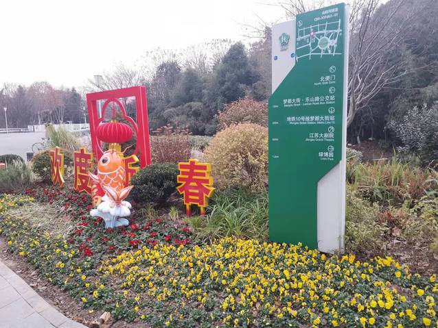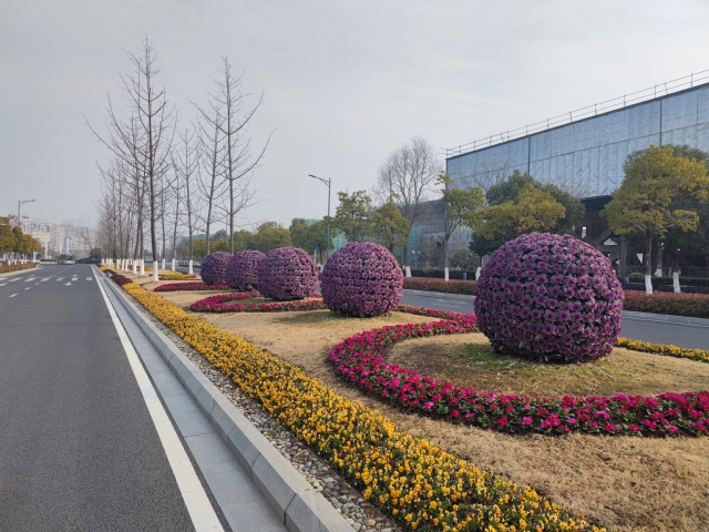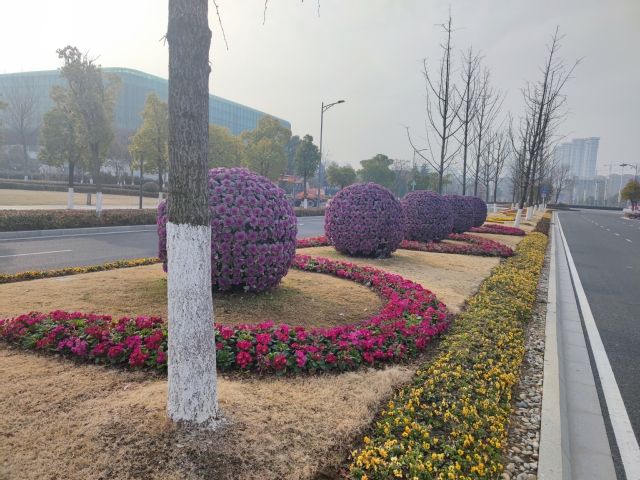 南京奧體中心北門夢都大街人行道旁新增設(shè)一組 “歡度新春”花境式小品生態(tài)微景觀,深紫色羽衣甘藍(lán)與黃色三色堇植物的搭配,簡潔明了,“鯉魚躍龍門”小品和“歡度新春”字樣的組合營造出濃濃的年味。道路中分帶的花球換上了“新裝”,4個巨大的羽衣甘藍(lán)花球在太陽下盡情地綻放著,烘托出了冬奧會的隆重氣氛,寓意在歡度新春佳節(jié)之際,祝愿冬奧會的奧運(yùn)健兒們能夠魚躍龍門創(chuàng)佳績。