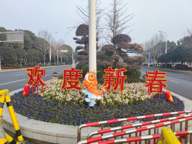 江蘇大劇院北門夢都大街中分帶,喬木造型樹下,鋪滿了粉色紫羅蘭和紫色三角堇花卉,冷暖色系進(jìn)行搭配分外醒目。錦鯉爆竹元素小品和歡度新春字牌,既簡約大氣又凸顯了紅紅火火迎新春的歡樂氣息。