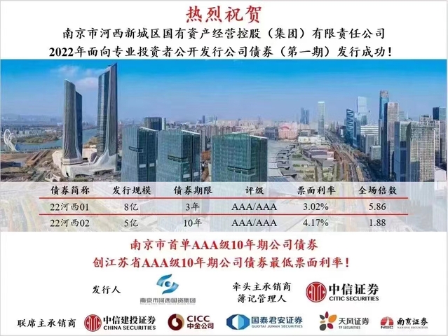 本次發(fā)行為批文下首期發(fā)行,由中信證券擔(dān)任牽頭主承銷商及簿記管理人,在主承銷商的共同努力下獲得了圓滿成功。本次發(fā)行獲得了市場投資者的高度認(rèn)可,體現(xiàn)了投資人對河西集團(tuán)未來業(yè)務(wù)發(fā)展的強(qiáng)烈信心!本次發(fā)行的10年期品種,亦為南京市首單10年期公司債券。河西集團(tuán)本次發(fā)行10年期公司債券,以較低的融資成本鎖定了長期的資金需求,充分體現(xiàn)河西集團(tuán)對市場時機(jī)的準(zhǔn)確把握以及對直融市場融資工具成熟的使用能力,為債券市場作出了積極的示范效應(yīng)。