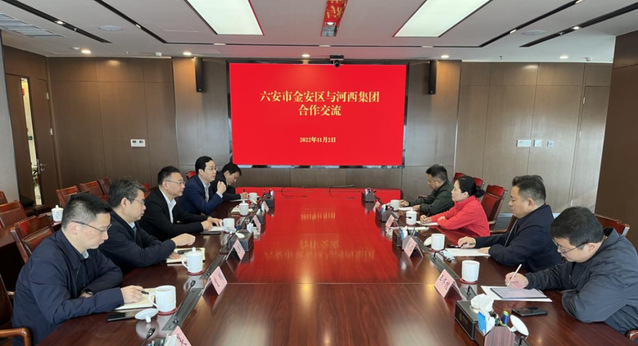 2022年11月2日,六安市金安區(qū)委副書記、區(qū)長黃媛媛,金安經(jīng)濟開發(fā)區(qū)管委會書記、主任程旭,金安區(qū)政協(xié)副主席方明,金安經(jīng)濟開發(fā)區(qū)投資促進局局長王懷槐一行蒞臨河西集團考察交流。河西集團總經(jīng)理、黨委副書記、董事何流,副總經(jīng)理、黨委委員呂道峰,河西集團園林經(jīng)濟公司董事長趙康兵,南京河西私募基金管理有限公司執(zhí)行董事曹鵬接待并進行座談。