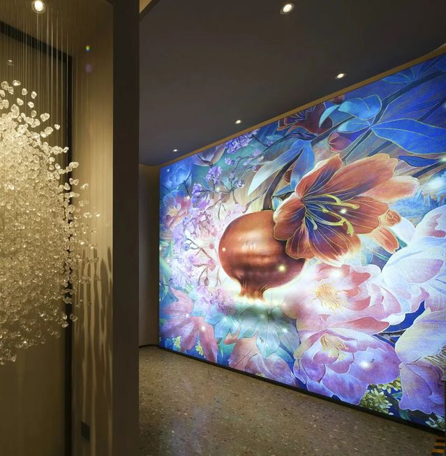 “人間歡喜事,石榴成熟時”,藝術(shù)生活館中一幅瑰麗絢爛的手繪花神圖渲染出主題氛圍,鮮花簇?fù)眍w粒飽滿石榴的畫幅,姹紫嫣紅中,將奧體公司開發(fā)的奧體新城各小區(qū)名稱中的植物元素有機組合在一起,觀眾置身其中,仿佛能聞到花的芳香、看到石榴籽的晶瑩剔透。畫面寓意著花開興隆、興旺昌盛,祝福幸福美好生活紅紅火火,也體現(xiàn)了河西集團“開發(fā)幸福、運營美好”的經(jīng)營理念。整幅花神圖由特邀手繪師親繪而成,十分珍貴。