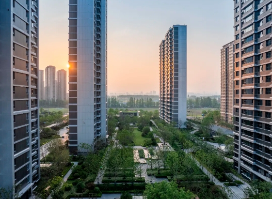 小區(qū)以1300平方米的陽光草坪為核心,烏桕林、櫻花林與低矮灌木穿插其間,形成“花葉共賞、四季生機”的浪漫花廊;烏桕林與水景水系則構(gòu)成“水榭林間”中央景觀軸,融入生態(tài)草坪設(shè)計,增強了居民與自然的互動體驗。